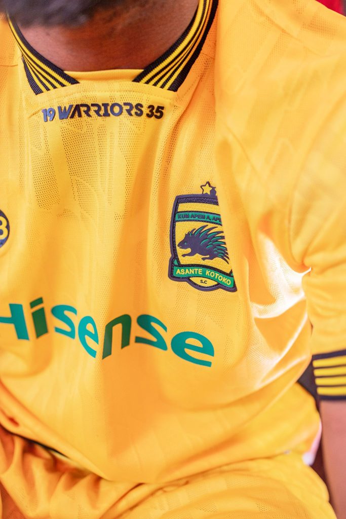 The Away Kit also features a vibrant full-yellow ensemble that contrasts the home colors, offering bold visual distinction for matches away from Kumasi. Also produced by the Ghanaian‑owned brand THB.