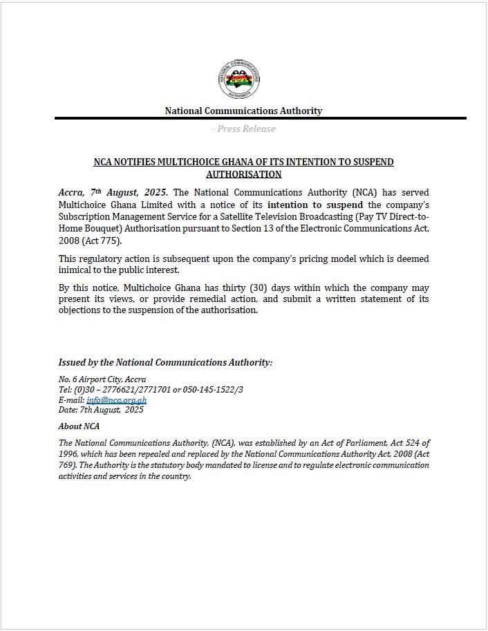 The National Communications Authority (NCA) has formally issued a notice to Multichoice Ghana Limited of its intention to suspend the company’s authorisation to operate Pay TV services in Ghana.