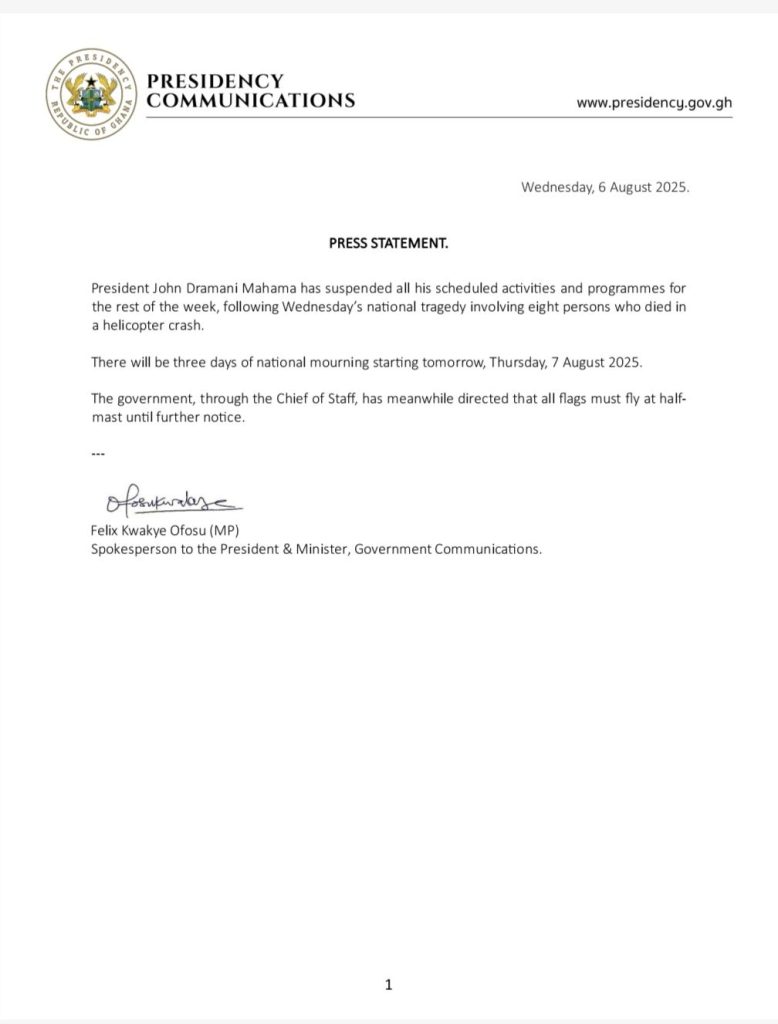 President John Dramani Mahama has declared three days of national mourning, beginning Thursday, August 7, 2025, following the tragic military helicopter crash that claimed the lives of eight individuals, including two senior government ministers and three military personnel.
