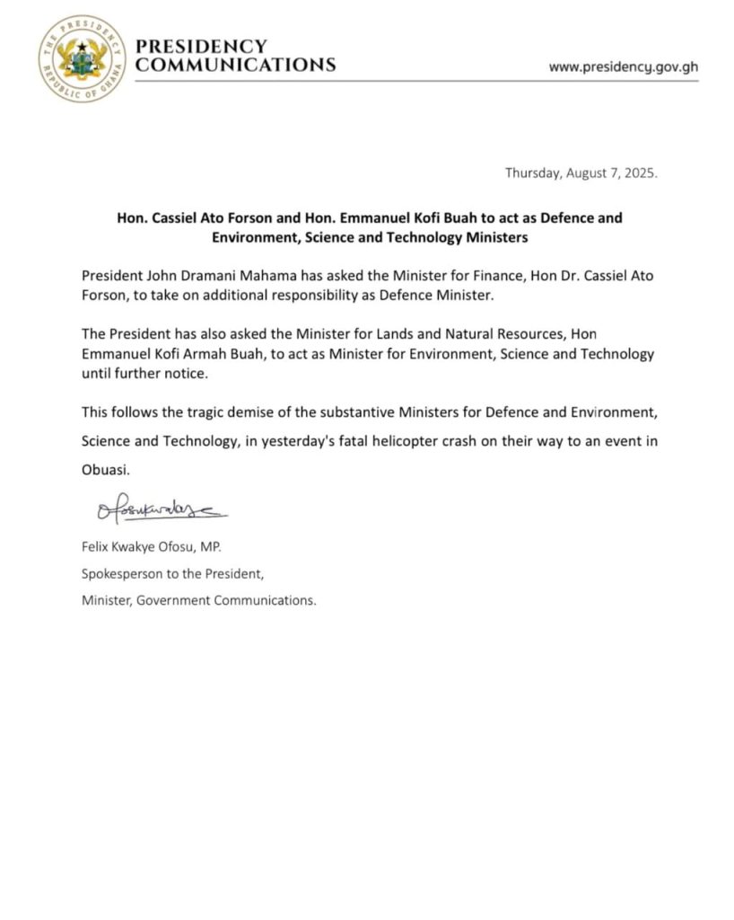 These interim appointments follow the untimely deaths of Defence Minister Dr. Edward Omane Boamah and Environment Minister Alhaji Dr. Ibrahim Murtala Mohammed, who died in a helicopter crash on Wednesday, August 6, 2025, alongside six others.