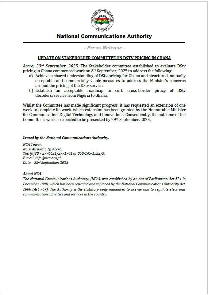 The National Communications Authority (NCA) has announced that the stakeholder committee reviewing DStv pricing in Ghana will submit its final report on Monday, September 29, 2025.