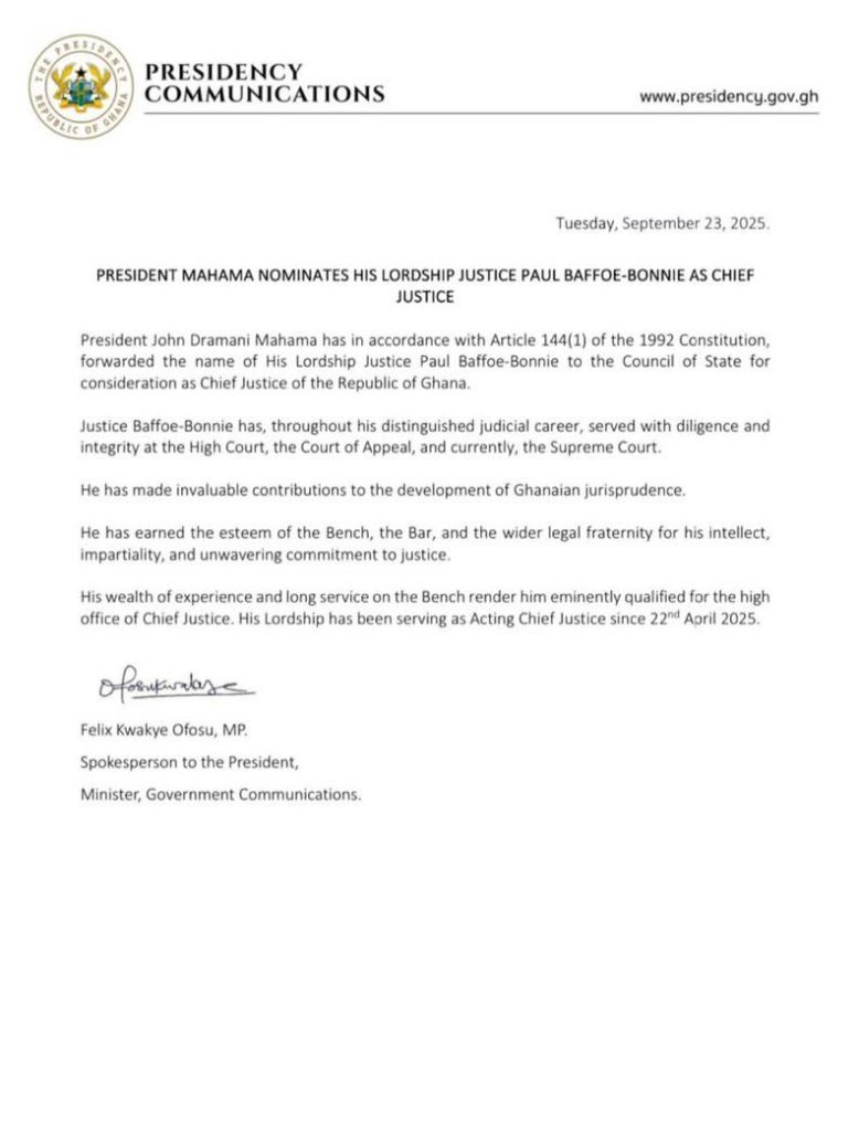In a statement issued by the Presidency, the President has written to the Council of State seeking its advice on the nomination, describing Justice Baffoe-Bonnie as a jurist who has “served with diligence and integrity” and made “invaluable contributions to the development of Ghanaian jurisprudence.”