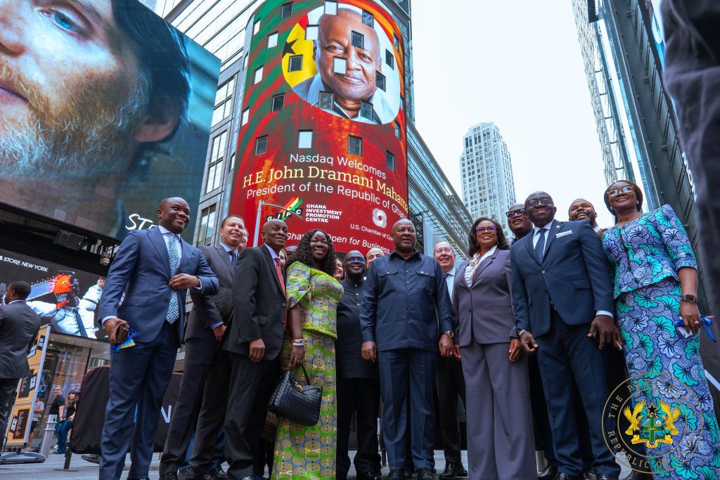 The event featured President Mahama’s image prominently displayed on the iconic Nasdaq billboard in Times Square, accompanied by the message: “Ghana is Open for Business.” The occasion set the stage for the U.S.-Ghana Executive Business Roundtable, co-hosted by the U.S. Chamber of Commerce and the Ghana Investment Promotion Centre (GIPC).