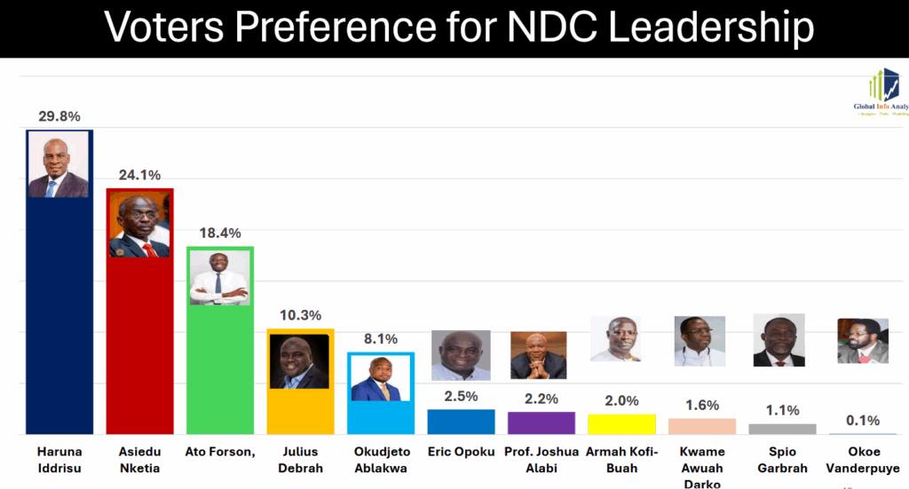 The poll results suggest that while Haruna Iddrisu is currently the clear frontrunner, his absence would set the stage for a fierce two-way contest between Asiedu Nketia and Ato Forson — potentially reshaping the NDC’s succession landscape.