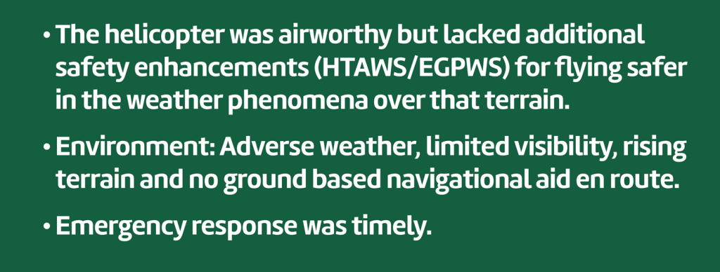 He explained that the helicopter was not equipped with essential systems such as the Helicopter Terrain Awareness and Warning System (HTAWS/EGPWS), advanced terrain mapping navigation, and automatic flight control systems — features that could have improved situational awareness and prevented controlled flight into terrain.