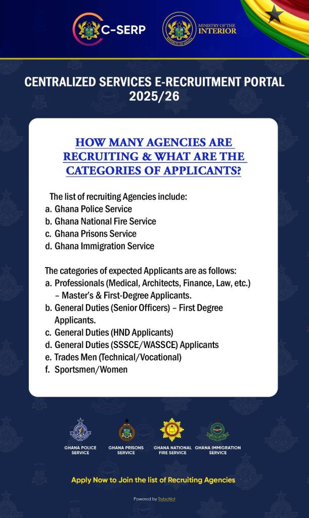Ghana’s nationwide recruitment exercise for all internal security agencies officially begins today, Monday, November 17, 2025, with the Centralised Services E-Recruitment Portal (C-SERP) set to open for applications at 12 noon.