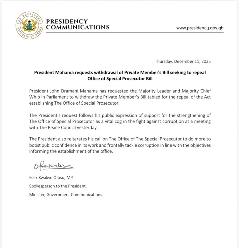President John Dramani Mahama has directed Majority Leader Mahama Ayariga and Majority Chief Whip Rockson Nelson Dafeamekpor to withdraw a Private Member’s Bill aimed at repealing the Office of the Special Prosecutor Act.